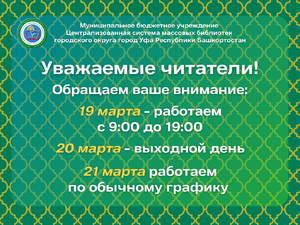 График работы библиотеки в праздничные дни, посвященные празднику Ураза-байрамДорогие читатели! Обращаем ваше внимание на изменение графика работы библиотеки в праздничные дни, посвященные празднику Ураза-байрам. 19 марта - библиотека работает с 09:00 до 19:00 часов. 20 марта - выходной день. 21 марта - библиотека работает по обычному графику. Приходите, мы всегда вам рады!!!