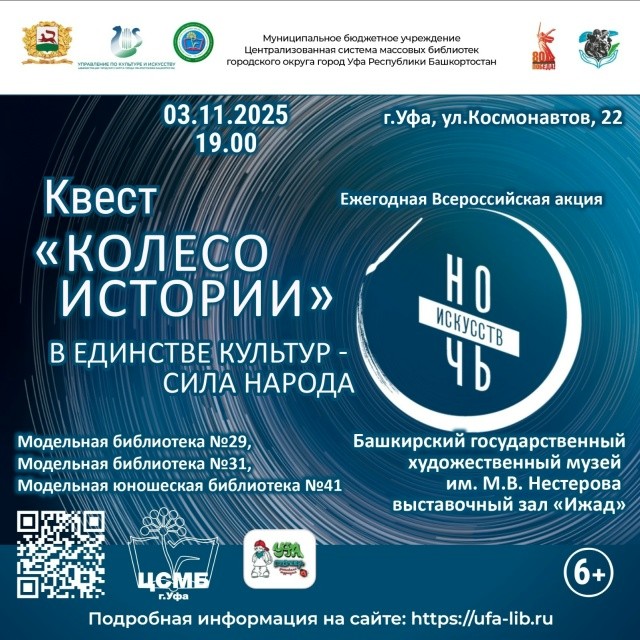Квест "Колесо истории": погружение в культурное наследие народов России 3 ноября в рамках Ежегодной Всероссийской акции "Ночь искусств-2025" Выставочный зал "Ижад" Башкирского государственного художественного музея им. М.В. Нестерова откроет двери для увлекательного события: квеста "Колесо истории". Участников ждет захватывающее путешествие в мир традиций, фольклора и культурного наследия разных регионов нашей огромной страны. Модельные библиотеки № 29, 31, а также модельная юношеская библиотека № 41 подготовили разнообразные интерактивные локации, каждая из которых станет настоящим испытанием смекалки и эрудиции участников: • Разгадывание загадочных пословиц и поговорок, отражающих мудрость поколений; Чтобы успешно справиться с заданиями, понадобятся логика, внимательность и знание русского фольклора. Мы ждем всех любителей истории и активного досуга, готовых присоединиться к нашему интересному приключению! Погрузитесь в чарующий мир русской народной мудрости, почувствуйте себя исследователями культурных сокровищ России и испытайте удовольствие от знакомства с культурой нашего многонационального государства. До встречи 3 ноября в 19:00 часов в Выставочном зале «Ижад» по адресу г. Уфа, ул. Космонавтов, 22.