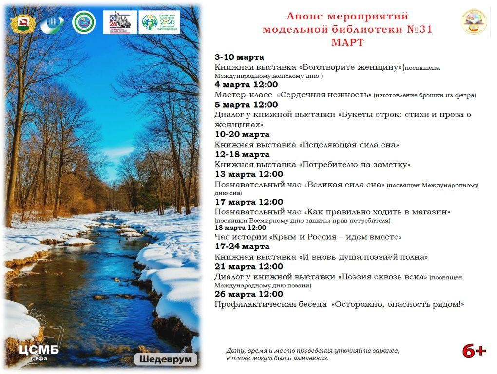 Модельная библиотека №31 города Уфы приглашает на мероприятия в мартеУважаемые читатели и гости города! Приглашаем Вас посетить модельную библиотеку №31 города Уфы! Подробнее о мероприятиях читайте на сайте в библиотеки, в разделе "Анонсы! https://31.ufa-lib.ru/anonsy Вас ждут интересные мероприятия и приятное общение с книгой!